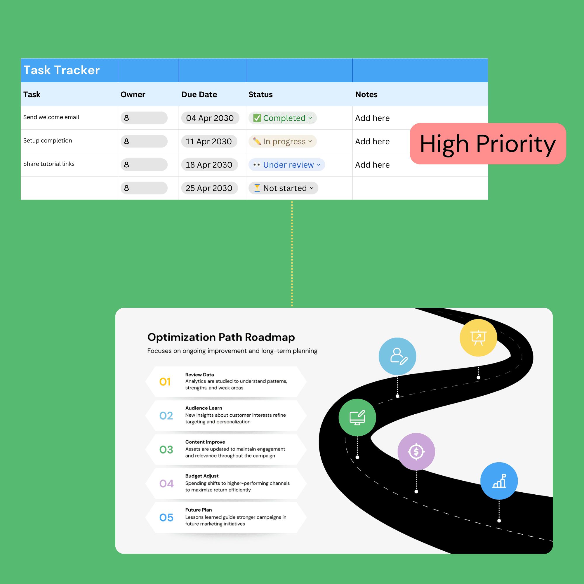 Ongoing tracking, performance review, and process refinement to grow efficiently without burnout.